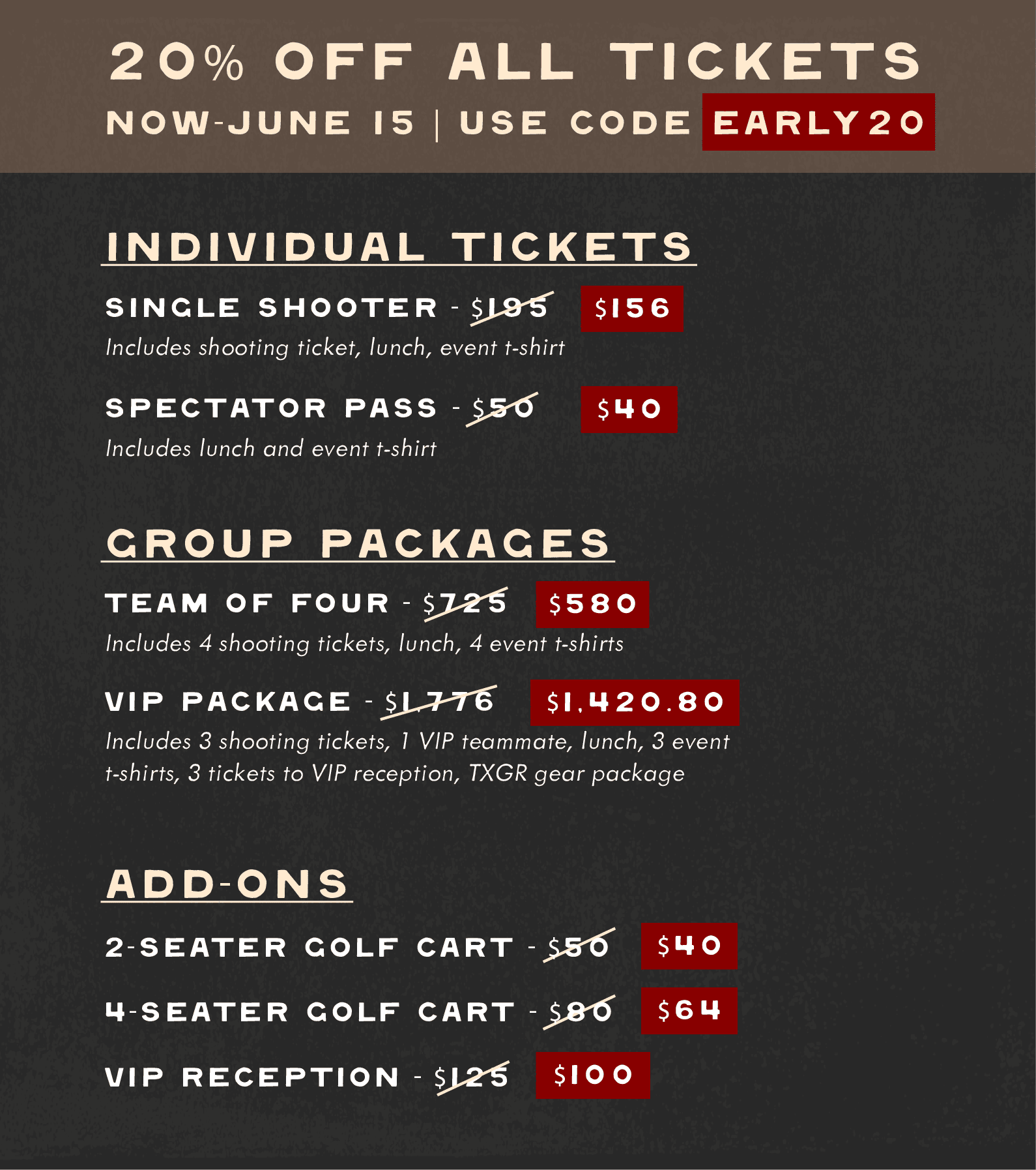 Includes 3 shooting tickets, 1 VIP teammate, lunch, 3 event t-shirts, 3 tickets to VIP reception, TXGR gear package