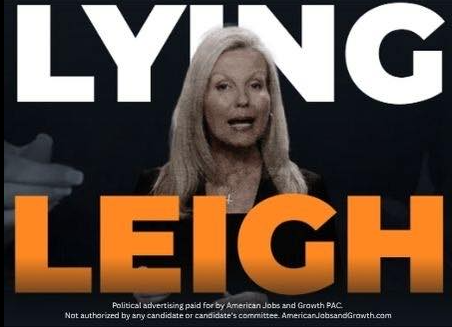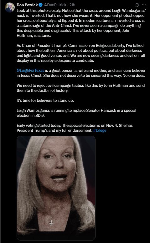 In the Senate District 9 special election, a pro-John Huffman PAC — American Jobs and Growth PAC — sent voters a mass text message featuring a photoshopped image of opponent Leigh Wambsganss wearing an inverted cross around her neck.