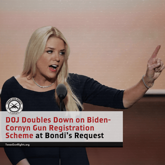 - Chip in to Texas Gun Rights. Help us fight Bondi, expose Cornyn, and stop backdoor registration schemes.