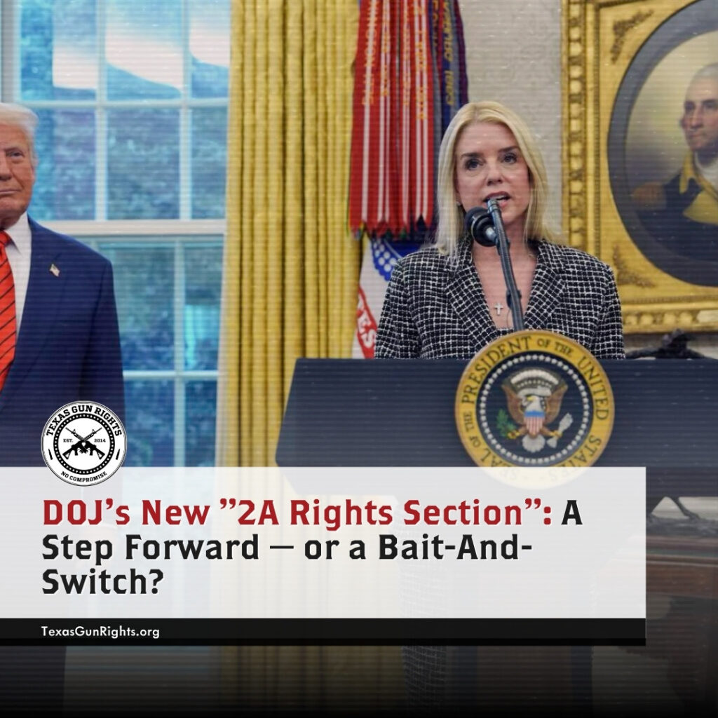 That’s why Texas Gun Rights will monitor every move this new 2A Rights Section makes, put pressure the White House to keep the DOJ in line and mobilize millions of Texans to ensure liberty wins.